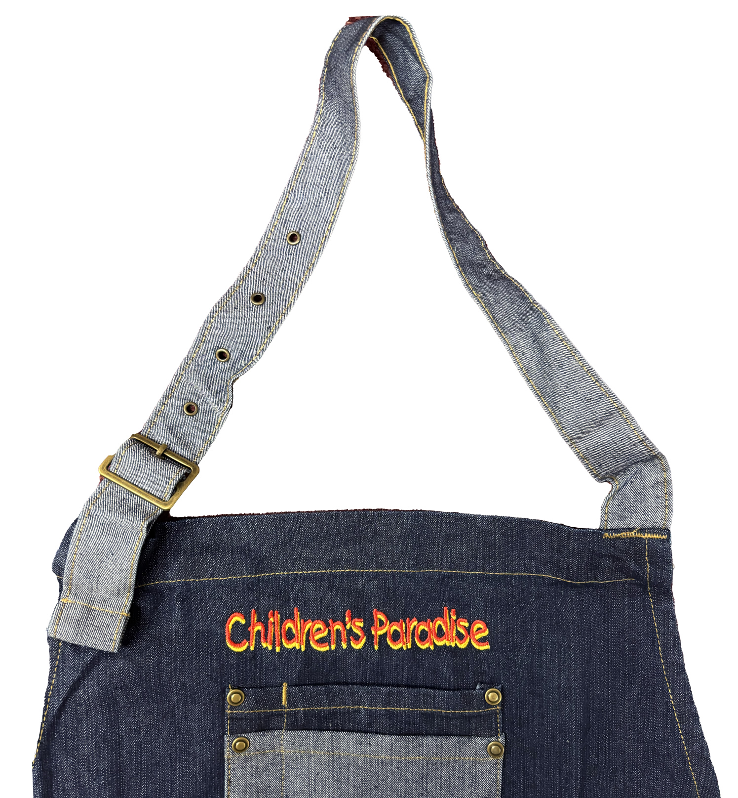 Denim Unisex Apron – One Size Fits All – Adjustable neck strap, tie in back, front pockets, rivet detail,