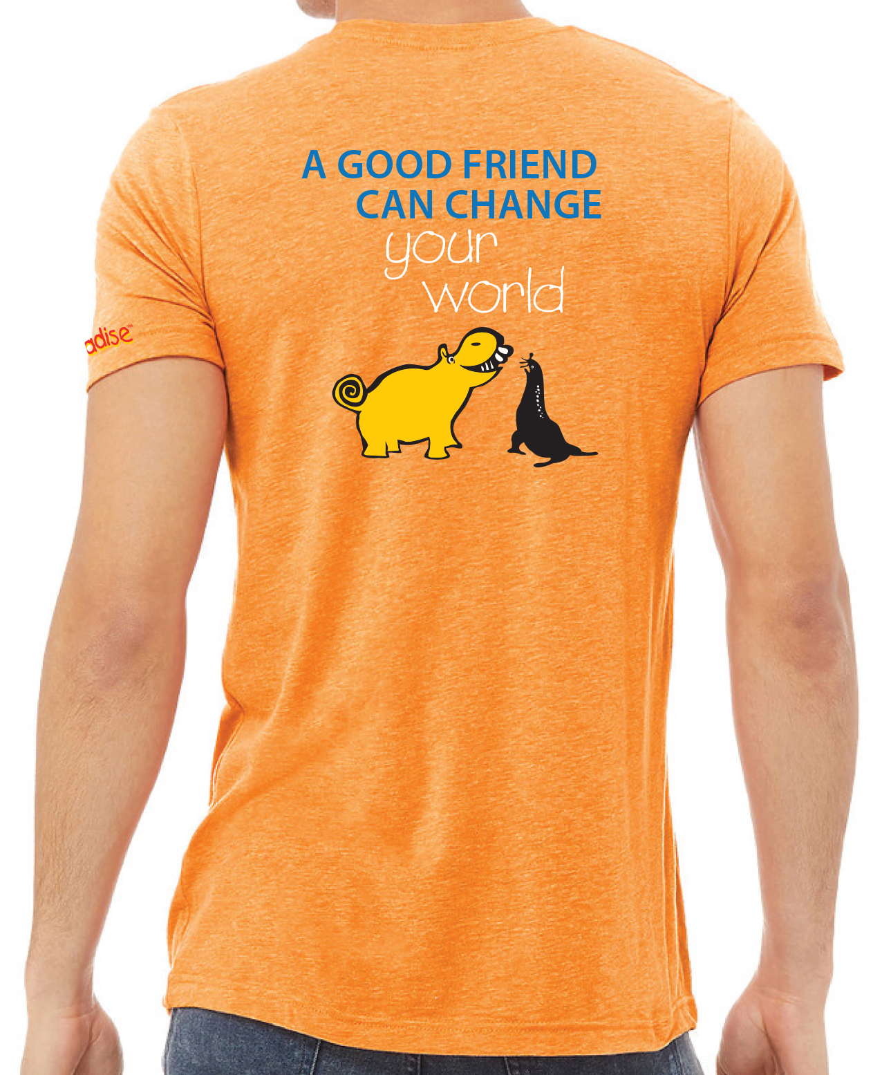 Orange heather v-neck OR crew neck tshirt with “bff BUILDER” on the front left. The back message reads “A Good Friend Can change Your World”, with your company logo on left sleeve.